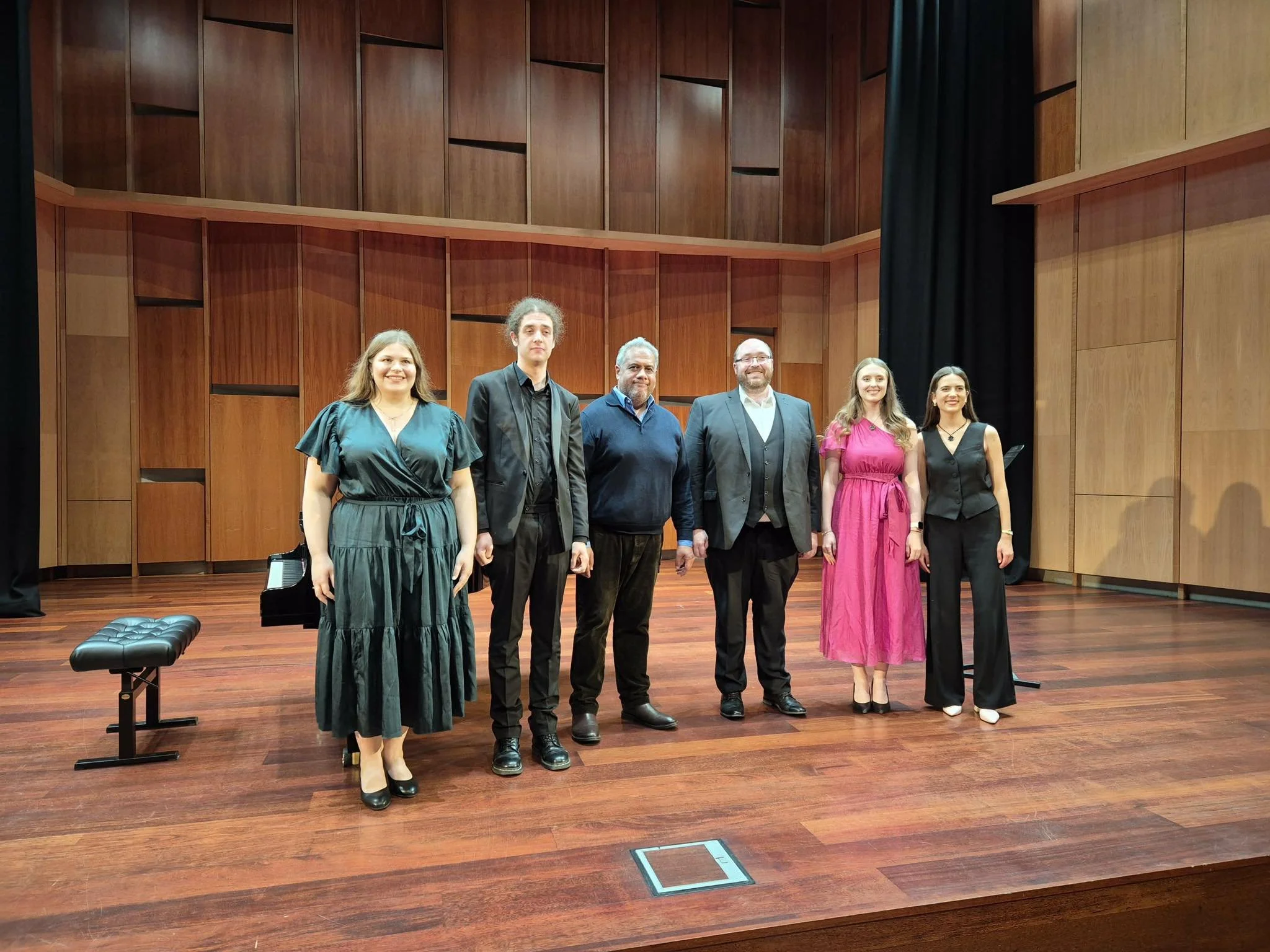 Pictured here following a superb masterclass on 17 November, L to R: Erin Connelly-Whyte, Kahu Gray, Jonathan Lemalu, Stephen Moseley, Elizabeth Ellison, and Holly Evans. Photograph © Alex Robinson for Toi Toi Opera 2025