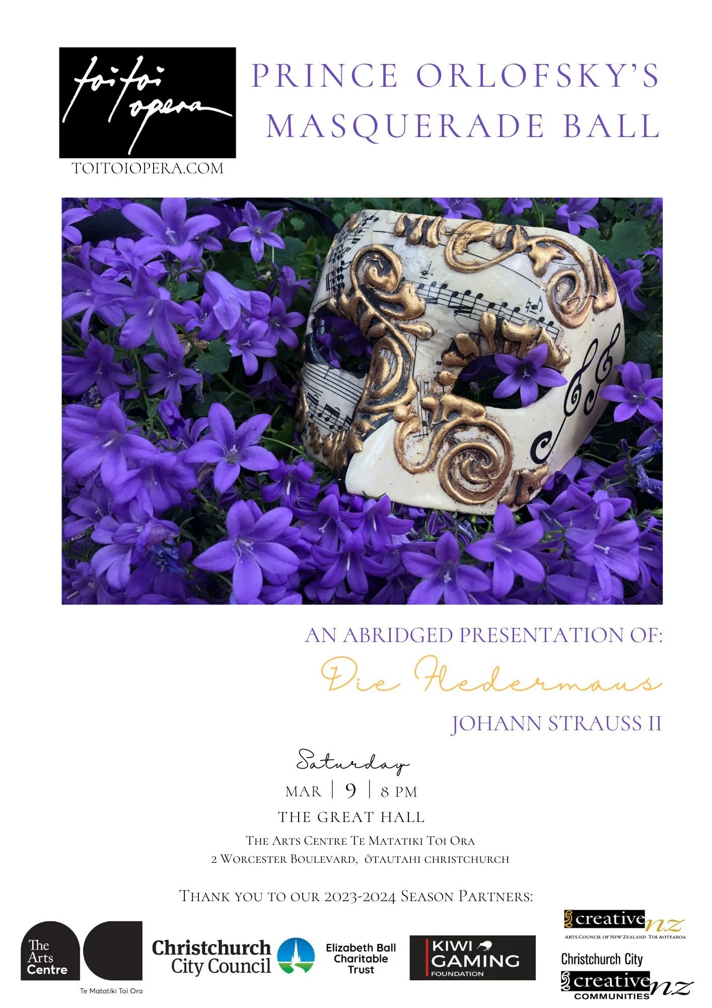 †Venue: The Great Hall, The Arts Centre Te Matatiki Toi Ora. SEASON SOLD OUTThese very special Toi Toi Opera Summer of Opera events were proudly sponsored by: