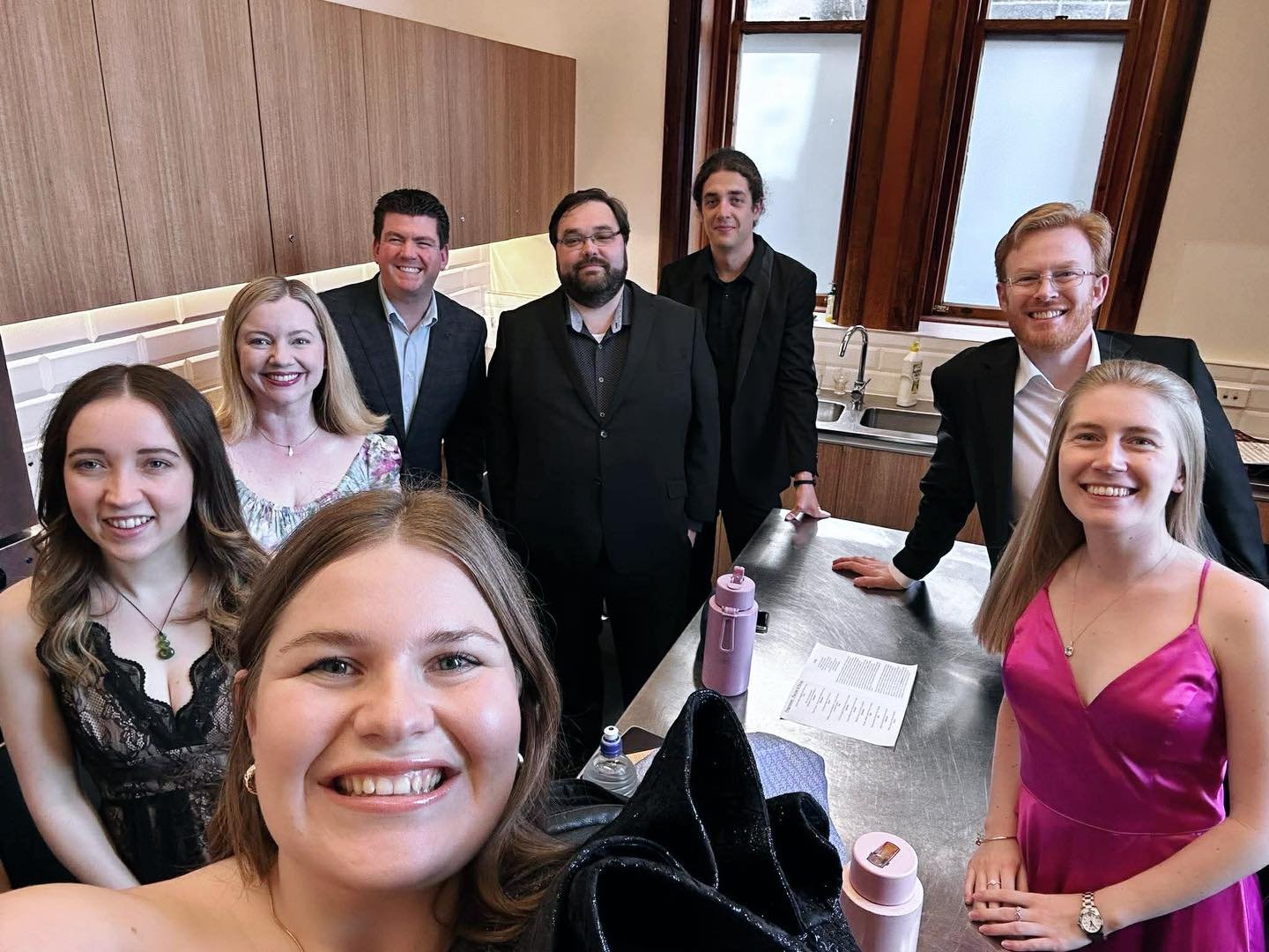 The artists enjoying a moment backstage together prior to their sold out Great Hall Lunchtime Concert on 16 March, clockwise from bottom: Erin Connelly-Whyte, Alannah Hounsome-Vail, Katherine Doig, Jeremy Woodside, David Moseley, Kahu Gray, Alex Robinson, and Alexandra Hope Watson.